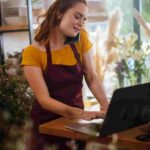 woman in a white blouse using a digital tablet while standing in a modern, brightly lit office or studio space